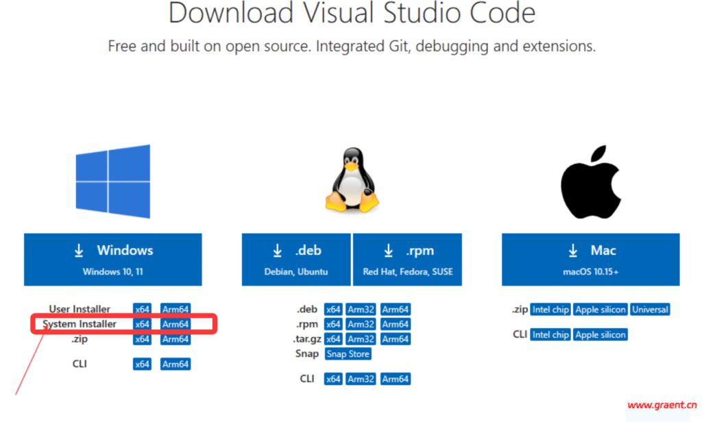 翻译大体意思就是用户安装文件不是用来给管理运行的,如果想要在当前系统安装vscode,需要下载系统安装文件运行,方法就是点击download按钮进入各个版本的下载页面,如下: