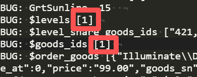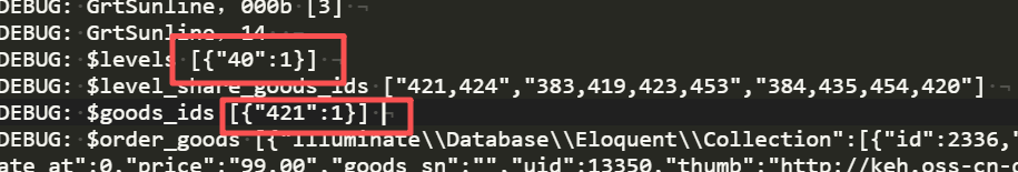 实际上结果是类似[421=>1]的数组,通过搜索和尝试发现这么一个说明:使用 \Log::debug('$order_goods',$order_goods);